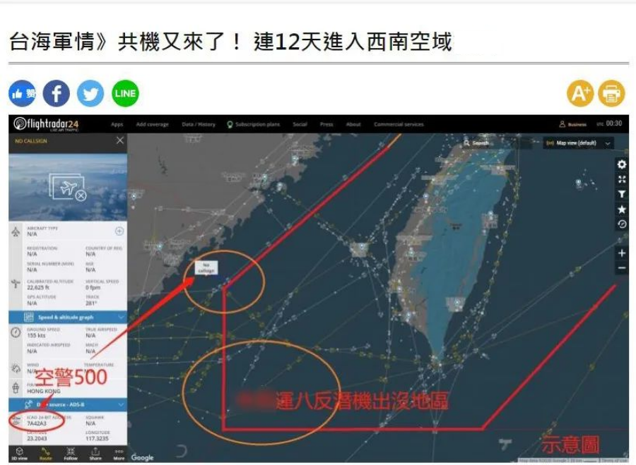 據(jù)臺(tái)灣資深軍事迷的分析,解放軍當(dāng)天派出的應(yīng)是運(yùn)-8型反潛機(jī),而另外在汕頭外海6900米的高度,還疑似出現(xiàn)了一架空警-500預(yù)警機(jī)提供預(yù)警指揮。