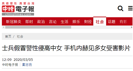據(jù)臺(tái)灣“中時(shí)電子報(bào)”等臺(tái)媒5日?qǐng)?bào)道,臺(tái)灣一名現(xiàn)役簡姓士兵,涉嫌性侵一名16歲女高中生,事后女生家屬將他痛毆一頓而鬧上警局,當(dāng)警方查看簡姓男子手機(jī)時(shí),發(fā)現(xiàn)除該女高中生外,還有多名女子疑被簡姓士兵性侵的視頻,認(rèn)為受害者至少7人以上,且不乏未成年學(xué)生。臺(tái)警方呼吁受害者勇于挺身而出,使其繩之于法。