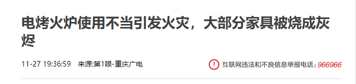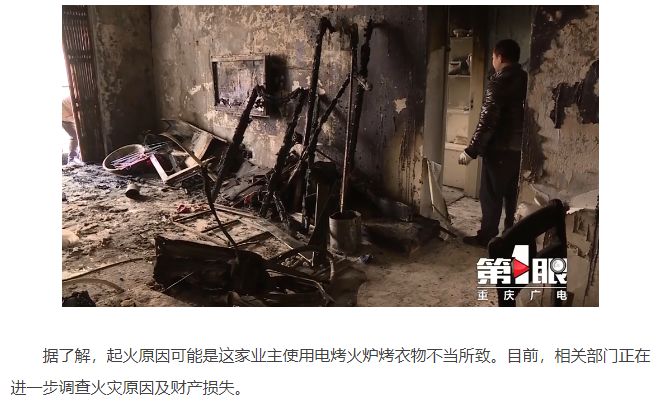 今年11月25日,在重慶江北區(qū),一戶人家因?yàn)槭褂秒娍净馉t烤衣物不當(dāng)引發(fā)火災(zāi),大部分家具被燒成灰燼,所幸火災(zāi)發(fā)生時(shí),房?jī)?nèi)沒(méi)有人員在場(chǎng)。